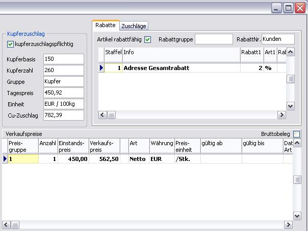 Sind für einen Artikel Zuschläge hinterlegt worden, wird neben dem Register Rabatte auch das Register Zuschläge angezeigt. Bei zugewiesenen Teuerungszuschlägen wird zusätzlich der Bereich Kupferzuschlag eingeblendet. Hier im Beispiel ist dem Artikel ein Teuerungszuschlag zugewiesen worden. Entsprechend berechnet sich dann der Verkaufspreis.
