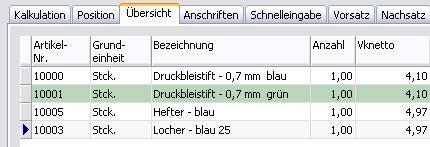In das Angebot wurde der "Druckbleistift - 0,7 mm blau" und der "Druckbleistift - 0,7 mm grün" übernommen. Dabei soll der grüne Druckbleistift die Alternative zu dem blauen sein. Sie markieren die Zeile "Druckbleistift - 0,7 mm grün" und rufen das Kontextmenü Alternative auf. Die Zeile wird farbig dargestellt - der Artikel wird damit zum "Alternativ-Artikel".