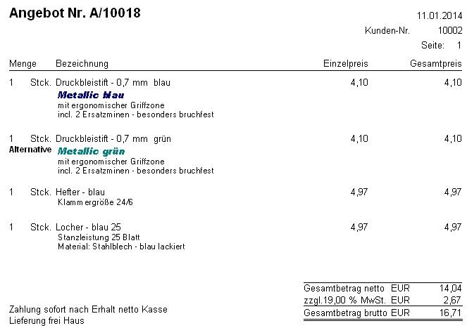 Der Ausdruck des Angebotes würde z.B. folgendermaßen aussehen: