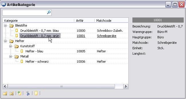 Hier im Beispiel sind der Kategorie "Bleistifte" direkt zwei Artikel zugeordnet worden. Die Kategorie "Hefter" wurde in zwei Unterkategorien (Kunststoff und Metall) unterteilt. Den Unterkategorien wurde je ein Artikel zugeordnet.