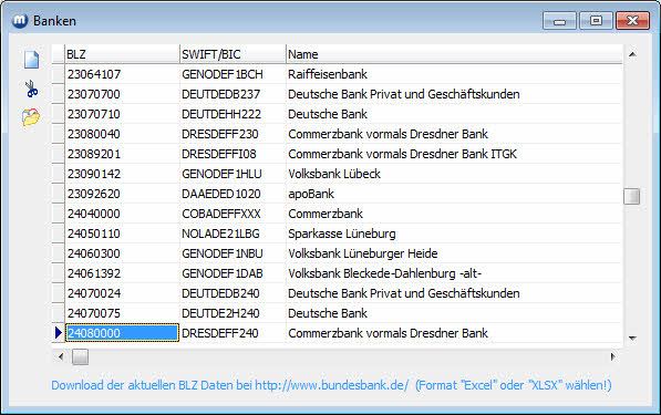 Sie können Banken mit Bankleitzahlen und SWIFT/BIC-Code über das Menü Finanzen/Parameter/Banken anlegen. Sie haben jedoch auch die Möglichkeit, eine Exceldatei von der Homepage der Bundesbank downzuloaden und anschließend zu importieren.