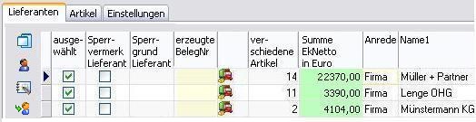 Hat eine Zeile der Spalte Summe EKNetto in Euro einen roten Hintergrund, hat entweder die Lieferantenadresse einen Sperrvermerk oder es haben ein oder mehrere Artikel einen Sperrvermerk oder sind als Auslaufartikel gekennzeichnet.