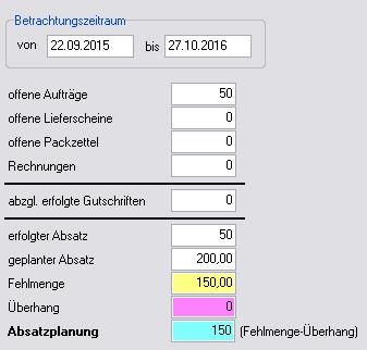 Wenn Sie mit der Absatzplanung arbeiten und Plandaten in die Bedarfsermittlung eingeflossen sind, sehen Sie im Register Absatzplanung Details dazu. In der linken Tabelle werden Ihnen mit Datum der geplante Absatz, der erfolgte Absatz und die zugehörige Belegnummer angezeigt. Die Berechnung der Daten sehen Sie auf der rechten Seite des Registers.