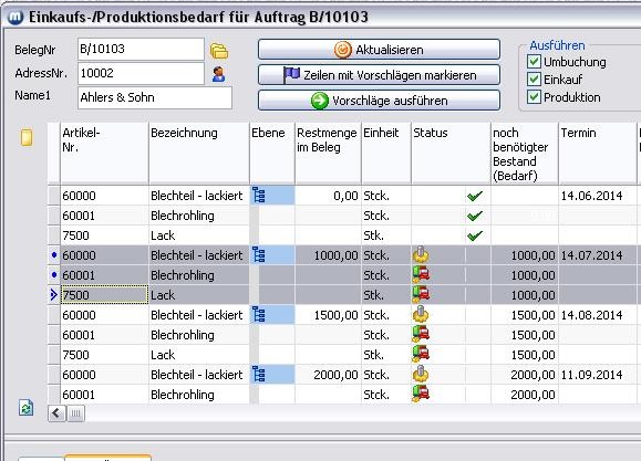 Aus dem Einkaufs-/Produktionsbedarf wurde für den Termin zum 14.07.2014 ein Einkaufbeleg und eine Produktion erzeugt.