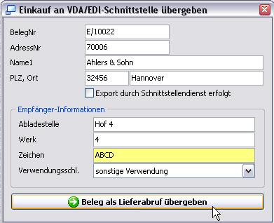 Aus dem Einkaufsbeleg kann nun über das Kontextmenü Übernahme/VDA/EDI-Schnittstelle (VDA4905) die Exportdatei erzeugt werden. Sie erhalten das Formular Einkauf an VDA/EDI-Schnittstelle übergeben.