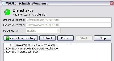 Wenn der VDA-Dienst zu diesem Zeitpunkt noch nicht aktiv ist, wird der Export in eine Warteschlange übergeben. Bei aktivem VDA-Dienst erfolgt der Export in das angegebene Verzeichnis. Von dort aus muss dann der Datentransfer vorgenommen werden.