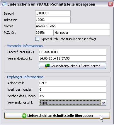 Der Lieferschein wird dann wiederum an die VDA-Schnittstelle über das Kontextmenü Übernahme/VDA/EDI-Schnittstelle (VDA4913) übergeben. Die Daten im Bereich Empfänger-Information stammen aus dem Abruf, der in den Auftrag eingelesen wurde.