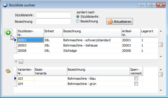 Mit Doppelklick auf der markierten Zeile (Stückliste oder Stücklistenvariante) rufen Sie die zugehörigen Positionen der Stückliste bzw. der Stücklistenvariante auf.