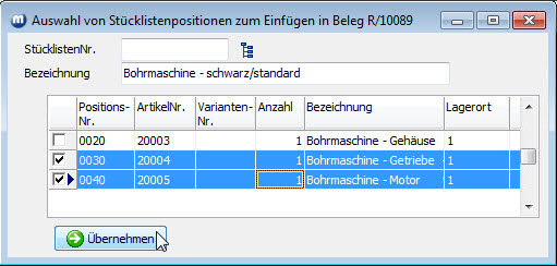 Hier können Sie auswählen, welche der Stücklistenpositionen in den Beleg übernommen werden sollen. Markieren Sie die Positionen und klicken Sie dann auf den Button Übernehmen.