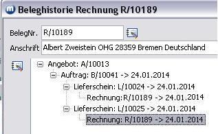 Beispiel: Ein Angebot wurde erstellt. Dieses wurde in einen Auftrag übernommen. Aus dem Auftrag wurden zwei Lieferscheine erzeugt. Aus diesen beiden Lieferscheinen wurde eine Rechnung erstellt.
