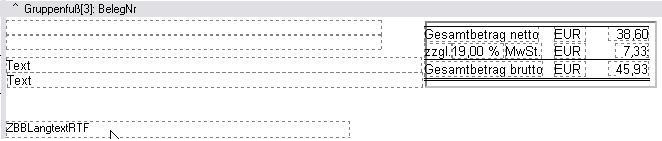 Je nachdem, ob Sie mit oder ohne RTF-Format arbeiten, muss nun das Feld ZBBLangtext oder ZBBLangtextRTF an die gewünschte Stelle im Beleg gezogen werden Hier im Beispiel in den Bereich "Gruppenfuß[3]". Für das Objekt sollte die Eigenschaft "Dehnen" ausgewählt werden (über Kontextmenü mit rechter Maustaste).