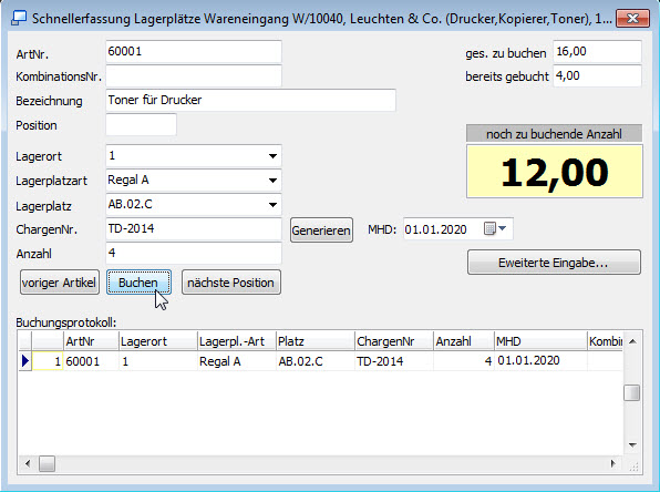 5. Geben Sie die zu verbuchende Menge in das Feld Anzahl ein und klicken Sie auf den Button Buchen. Diesen Vorgang wiederholen Sie solange, bis alle Mengen dieser Position verbucht sind.