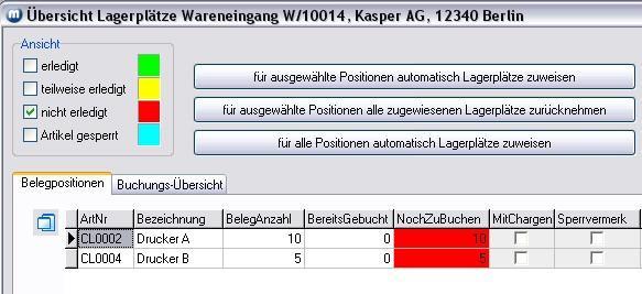 Das folgende Beispiel zeigt, dass im Wareneingang für 10 Stück "Drucker A" und 5 Stück "Drucker B" noch keine Lagerplätze zugewiesen wurden.