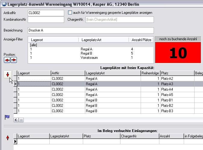 3. Markieren Sie die Lagerplätze (Zeilen), die für den Artikel vergeben werden sollen und klicken Sie dann auf den nach unten zeigenden Pfeil. Entsprechend Ihrer Auswahl werden die im Beleg verbuchten Einlagerungen (Entnahmen) in der unteren Tabelle angezeigt. Die noch zu verbuchende Anzahl reduziert sich entsprechend. Weisen Sie auf diese Art allen Artikel die Lagerplätze zu.