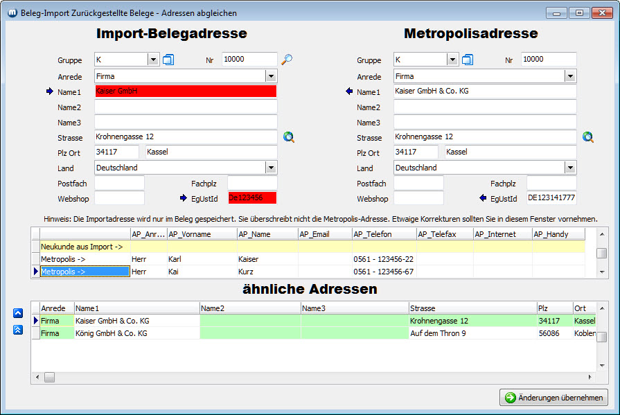 ----------------------------- Nur, wenn in der Konfiguration das Kontrollkästchen Belege mit unbekannten/geänderten Adressen beim Import zurückstellen, bis diese neu zugewiesen bzw. freigegeben sind aktiviert ist. |
