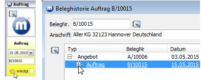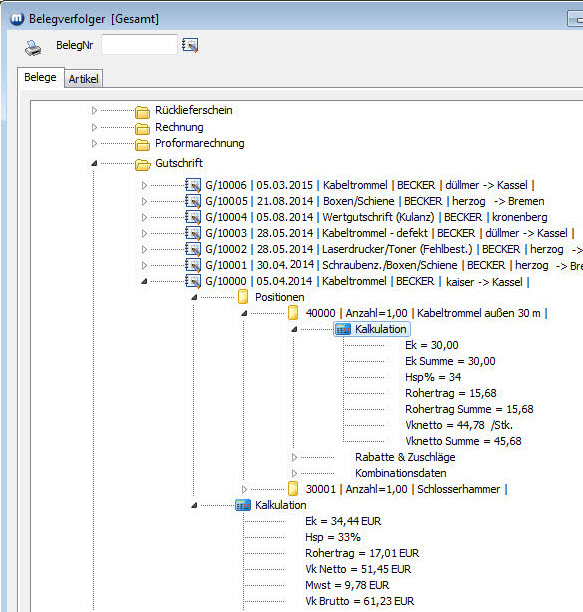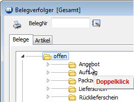 Bei Aufruf des Gesamtbelegverfolgers über die Hauptmenüs sowie in den Adress- und Artikelstammdaten öffnen und schließen Sie den Pfad mit Doppelklick auf der entsprechenden Zeile