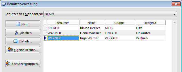 Rufen Sie das Menü Verwaltung/Benutzer auf, markieren Sie den zu löschenden Benutzer und klicken Sie dann auf den Button Löschen.