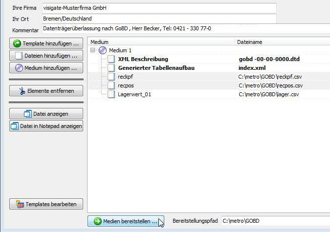 Bei der Bereitstellung der Medien werden alle, für den GoBD-Datenexport die erforderlichen, Dateien in einem separaten Bereitstellungspfad gespeichert.