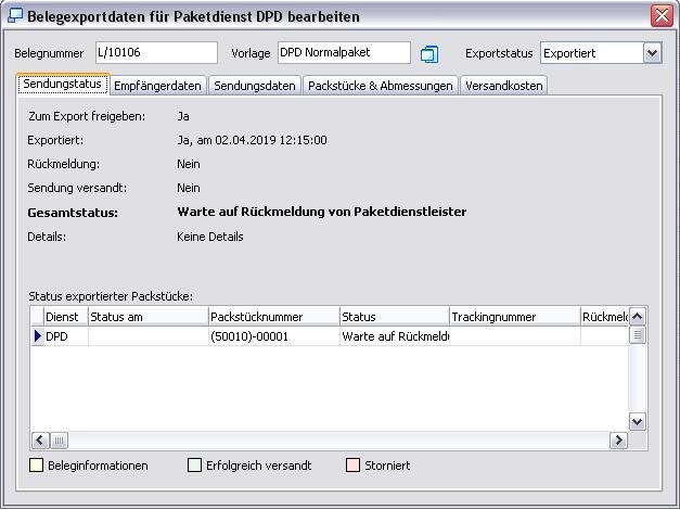 Der Gesamtstatus ist: "Warte auf Rückmeldung vom Paketdienstleister". (Zur Erinnerung: Damit Rückmeldungen erfolgen können, muss ein Häkchen im Kontrollkästchens Rückmeldungen auswerten in der Konfiguration, Register Belege Register Export zu Paketdiensten gesetzt sein.).