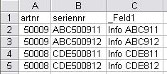 In der Exceldatei müssen die Artikel- und Seriennummern Überschriften (exakte Schreibweise - siehe im Beispiel) haben. Gleiches gilt für evt. _Felder. Hier können die Überschriften frei gewählt werden. Die Felder müssen jedoch mit einem "_" (Tiefstrich) beginnen.
