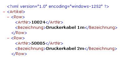 Beispiel einer erzeugten XML-Datei (Ausschnitt) gemäß der SQL-Anweisung SELECT ArtNr, Bezeichnung FROM art: