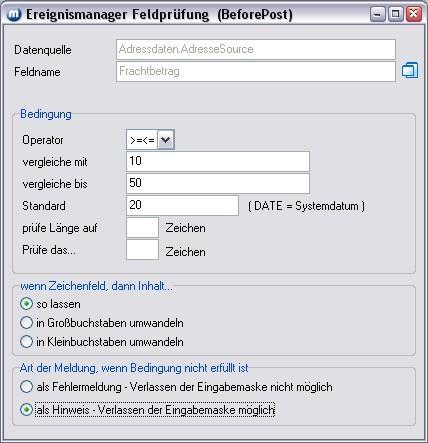 Beispiel - Pflichtfeld: In die Adress-Stammdaten soll immer ein Frachtbetrag von mindestens 10 und höchstens 50 eingetragen werden. Damit die Mitarbeiter dies nicht vergessen wird, soll für das Feld eine Eingabeprüfung stattfinden. Diese Prüfung findet statt, wenn die Adress-Stammdaten verlassen werden sollen, bzw. wenn die Adress-Stammdaten gespeichert werden sollen.