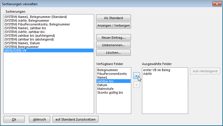 Hier im Beispiel wird eine neue Sortierung nach "VB" angelegt und die gewünschten Felder dazu ausgewählt.