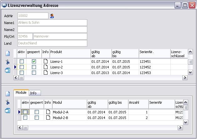 Adresse mit zugeordneten Lizenzen und Modulen - Beispiel:
