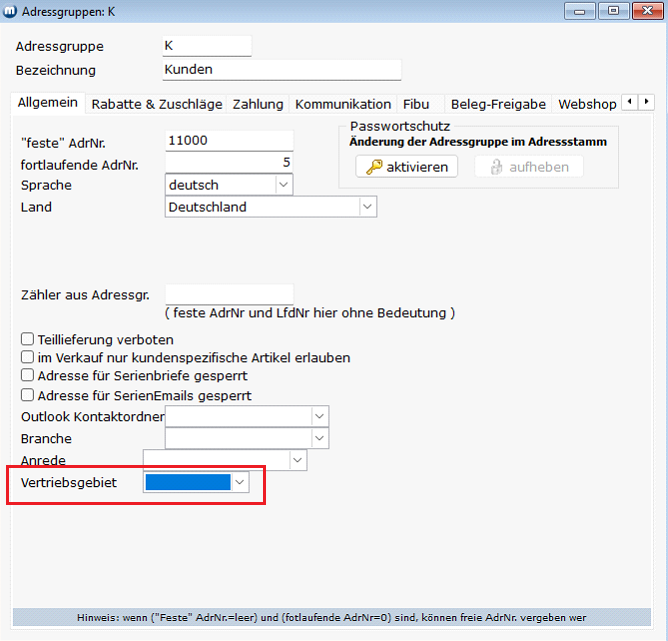 Die Voreinstellungen für Adressgruppen wurden um die Punkte Vertriebsgebiet, E-Rechnungsart und Versandart für Belege erweitert: