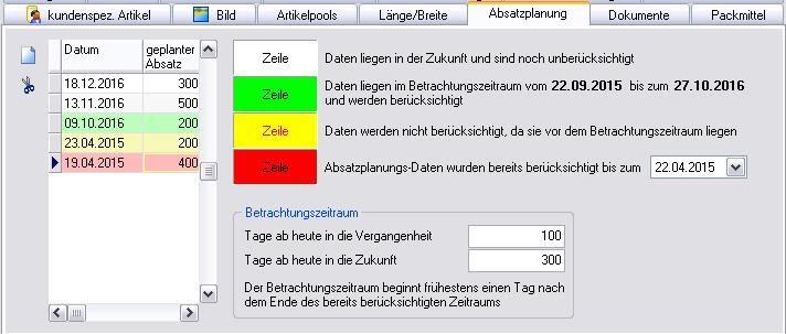 Je nachdem, wie Sie Ihren Betrachtungszeitraum wählen und die Daten der Absatzplanung bereits berücksichtigt wurden, werden die Daten farbig gekennzeichnet. [Der Betrachtungszeitraum (hier: 22.9.2015 - 27.10.2016) hat als Ausgangspunkt immer das gerade aktuelle Datum [welches in diesem Fall der 31.12.2015 war].