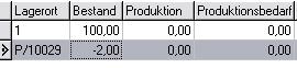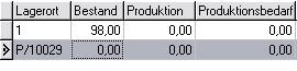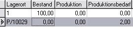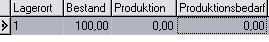 Wenn weder das Kontrollkästchen Produktionslagerort erzeugen (sonst Standardlagerort) noch Umbuchen von Standardlagerort zum Produktionslagerort aktiviert sind, wird nach dem Erzeugen des Einkaufs (Button Einkauf erzeugen im Formular produktionsbezogene Anfrage/Einkauf) für die Stücklisten-Elemente der Produktionsbedarf ausgegeben
