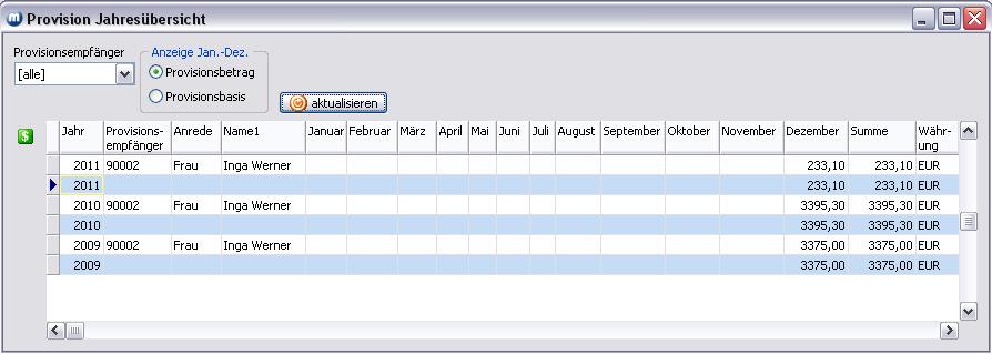 Je nach eingestelltem Intervall und durchgeführten Provisionsabrechnung werden die entsprechenden Monatsspalten mit den Werten Provisionsbetrag oder Provisionsbasis gefüllt. Hier im Beispiel gibt es nur Einträge im Monat Dezember, weil für diese Provisionsempfängerin das Intervall "jährlich" eingestellt und dementsprechend nur 1 x im Jahr abgerechnet wurde. Über den Button