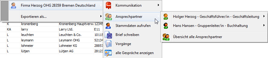 Alle Ansprechpartner einer Adresse im Adress-"Popup-Menü" anzeigen: Das Kontrollkäschten steuert das Verhalten der Anzeige von Ansprechpartnern in Kontextmenüs (z.B: Bei Aufruf des Kontextmenüs in der Tabelle der Adressen- oder Auftragssuche):