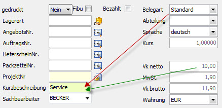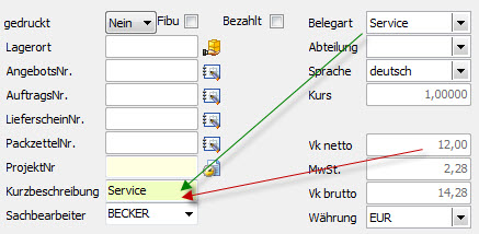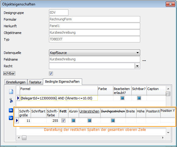 In dem nachfolgenden Beispiel soll in der Rechnung im Feld Kurzbezeichnung der Eintrag in roter (Wert 255) Schrift in der Größe 11 erscheinen, wenn die Belegart "Service" lautet und der Nettoverkaufspreis des gesamten Beleges gleich oder kleiner 10.00 ist.
