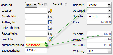 c) Es treffen die Bedingungungen "Belegart = Service" (BelegartId=123000006) und (NettoVk <= 10.00) zu, deshalb werden die Schriftgröße und Schriftfarbe entsprechend der Einstellungen gewechselt.