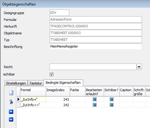 Rufen Sie dort das Register Bedingte Eigenschaften auf. In die erste Zeile der Spalte Formel geben Sie das eigene _Tiefstrichfeld mit Formel, z.B. _ZurInfo='' an und in die Spalte ImageIndex tragen Sie die Zahl 243 ein. Bedeutet: Wenn das Memofeld leer ist, zeige ein leeres Blatt im Registerkopf an. In die zweite Zeile der Spalte Formel geben Sie erneut das eigene _Tiefstrichfeld mit Formel, z.B. _ZurInfo<>'' an und in die Spalte ImageIndex tragen Sie die Zahl 242 ein. Das bedeutet: Wenn das Memofeld einen Eintrag hat, zeige im Registerkopf ein Blatt mit dem Buchstaben A an.