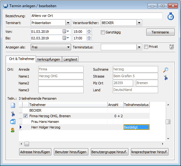 Adresse, Benutzer, Benutzergruppe, Ansprechpartner in Teilnehmerliste einfügen