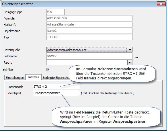 Über das Register Tastatur, können Sie unabhängig von der Cursorposition einen Tastencode für das Ansteuern eines Objektes bestimmen. Weiterhin kann auch ein Einsprungspunkt von einem Objekt aus bestimmt werden.