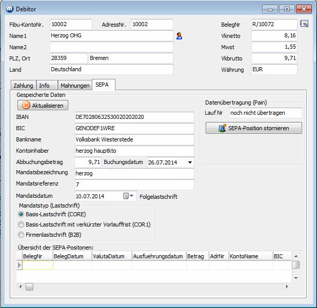 Die erzeugten Daten können Sie sich nochmals tabellarisch im Menü Finanzen/SEPA/SEPA Dateien anzeigen ansehen und ggf. Stornierungen durchführen.