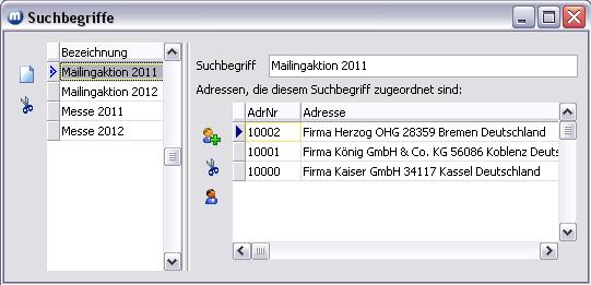 Im Menü Adressen/Parameter/Suchbegriffe können Sie Suchbegriffe, wie z. B. "Messe 2011", "Mailingaktion 2011", "Produktinformation" usw. definieren.