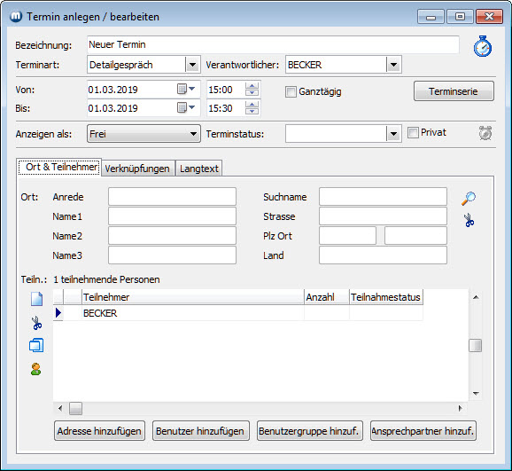Register Ort & Teilnehmer: Im Register Ort & Teilnehmer wird der Ort des Termins festgelegt sowie die Teilnehmer des Termins bestimmt.