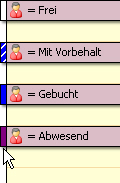 Anzeigen als: In dem Listenfeld Anzeigen als, können Sie für die Termine folgende Kriterien vergeben: Frei, Mit Vorbehalt, Gebucht, Abwesend. Im Terminkalender werden diese vor dem Termin in unterschiedlicher Weise dargestellt (nur bei Anzeige: Tag oder Werktage): Weiß = Frei, blau-schraffiert = Mit Vorbehalt, blau = Gebucht, rot = Abwesend. (Wird in den Termin geklickt, wird der Termin in der Farbe umrahmt.)