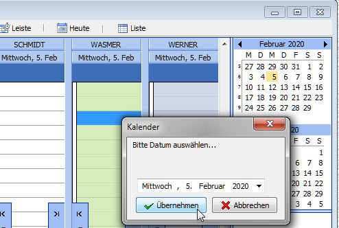 Mit dem Aufruf des Kontextmenü Datum auswählen wird das Formular Kalender angezeigt. Hier können Sie über das Listenfeld ein Datum auswählen und mit dem Button übernehmen, bestätigen. Die Kalenderanzeige springt dann automatisch zum gewünschten Kalendertag.