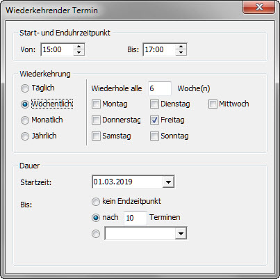 Hier in dem Beispiel soll sich der eingetragene Termin ab dem 01.03.2019 alle 6 Wochen immer freitags wiederholen und insgesamt 10 Mal stattfinden.