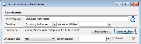 Über das Kontextmenü Terminserie löschen wird die gesamte Terminserie gelöscht.
