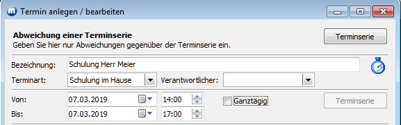 Das Formular Termin anlegen / Bearbeiten wird im oberen Bereich des Formular anders als bei Einzelterminen dargestellt. Es kann sowohl das Datum als auch die Uhrzeit verändert werden bzw. Ganztägig gewählt werden. Über den Button Terminserie gelangen Sie auf die ursprüngliche Serie des Termins.