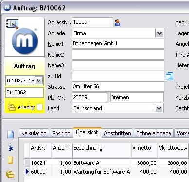 Beispiel: Für die Firma "Boltenhagen" wurde ein Auftrag erstellt. Die Rechnungsanschrift - (hier in der Grafik nicht zu sehen) ist eine abweichende Adresse.