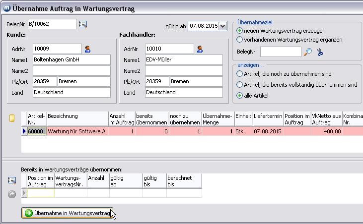 Klicken Sie dann auf den Button Übernahme in Wartungsvertrag.