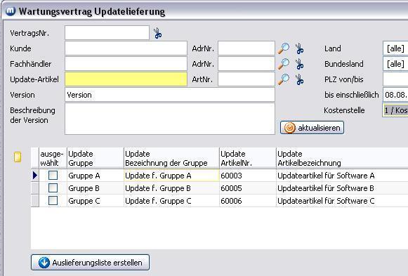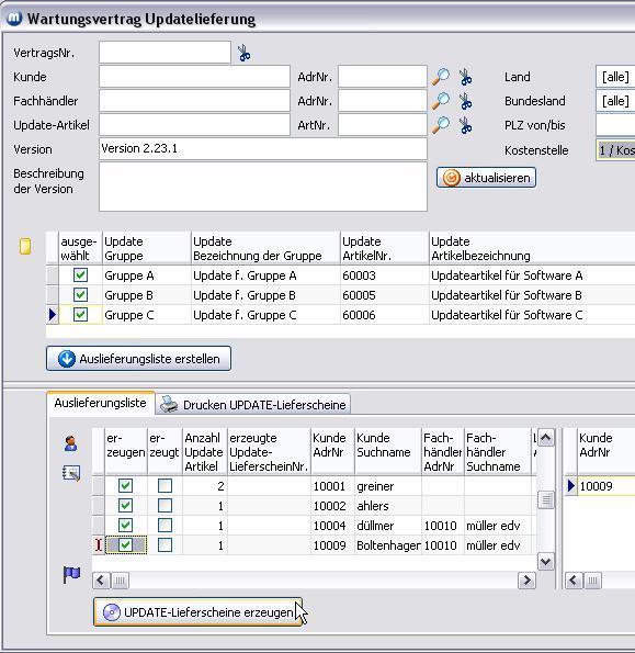 - Adress-Stamm: Kontextmenü Verkauf/Wartungsverträge/Adresse=Fachhändler/neue "UPDATE-Lieferung" -> nur Updatelieferungen an Fachhändler.