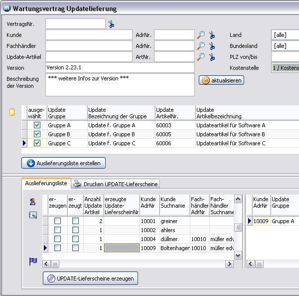- Adress-Stamm: Kontextmenü Verkauf/Wartungsverträge/Adresse=Kunde/neue "UPDATE-Lieferung" -> nur Updatelieferungen an den aktuellen Kunden
